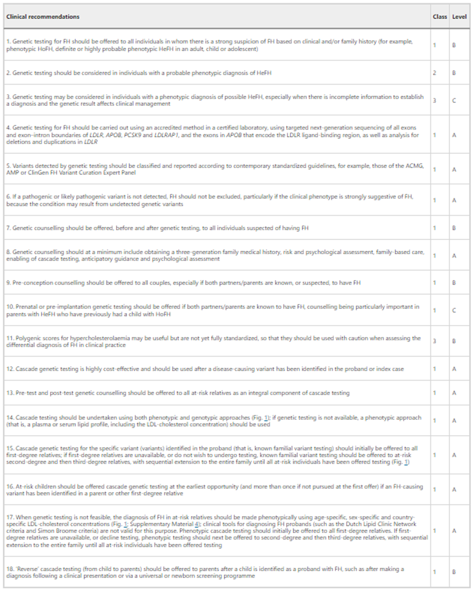 • “We recommend that genetic testing be offered, when available, to complement a diagnosis of FH and enable cascade screening (Strong Recommendation, High Quality Evidence). The decision to request genetic screening should be made by the treating physician after discussion with the patient.”