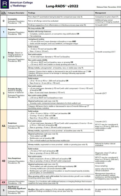 *This table is reproduced without alteration or edit in accordance with provisions in a Creative Commons License. The full document and license information can be found here: Lung Rads | American College of Radiology (acr.org)