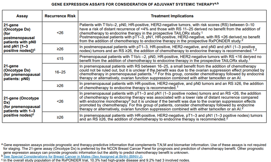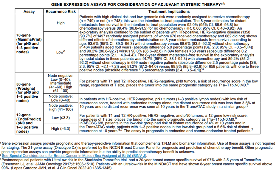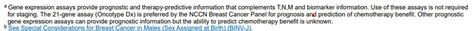 Note 3: As per NCCN Clinical Practice Guidelines in Oncology (Breast Cancer), “High clinical risk in the MINDACT trial was defined for grade 1 tumors as > 3 cm N0 or T2N1, for grade 2 tumors T2N0-1, and for grade 3 tumors T1c-2N0-1” (NCCN, 2024).