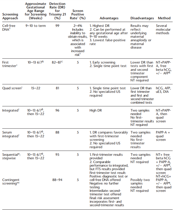 - First-trimester (defined as 11 – 14 weeks) screening incorporating maternal serum markers (hCG, PAPP-A with NT).